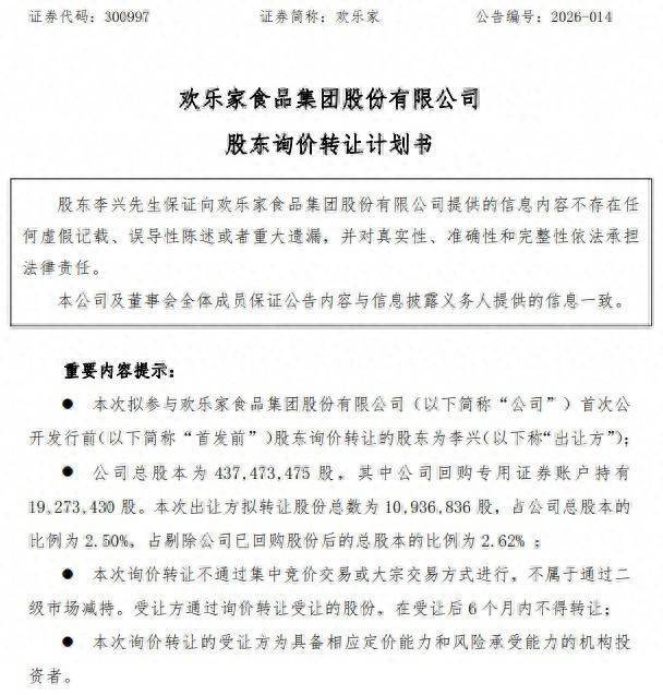 欢乐家2025年12月22日公告,股东豪兴投资、李兴和朱文湛拟询价转让公司股份,拟转让股份总数为1700万股,占公司总股本的比例为3.89%,占剔除公司已回购股份后的总股本的比例为4.07%。