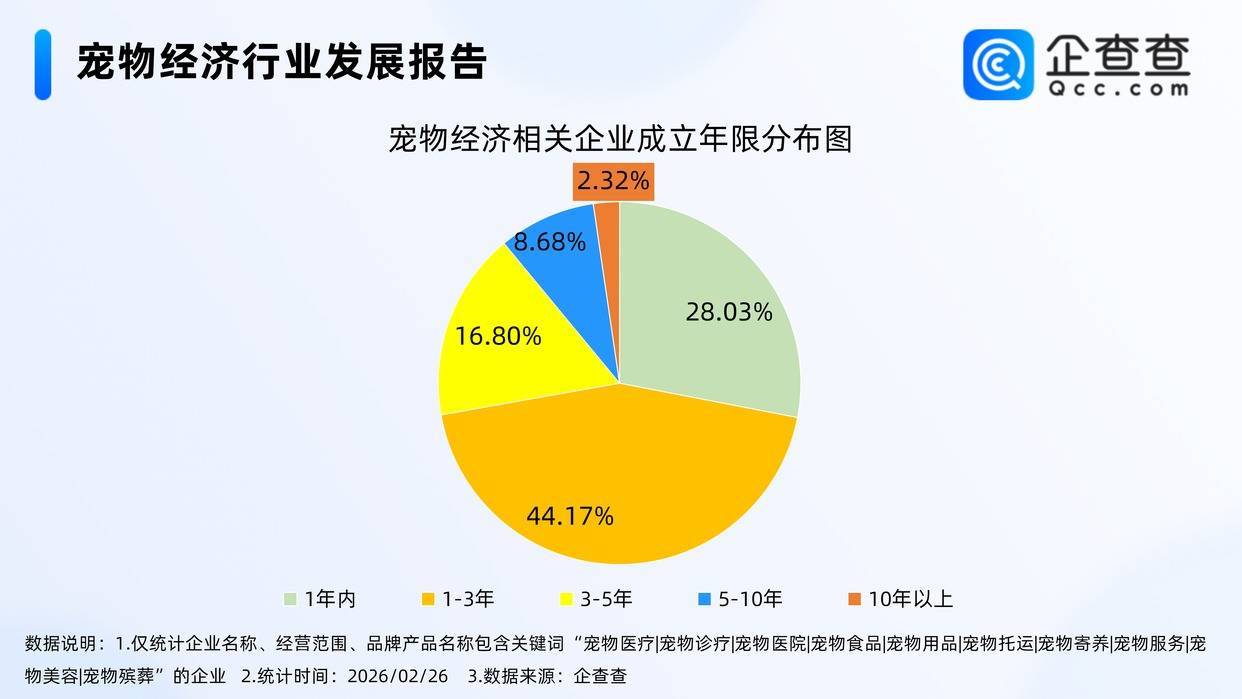 企查查数据显示,截至2月26日,国内现存宠物经济相关企业506.39万家。从经营时间来看,超7成相关企业成立于近三年,其中,成立年限在1-3年的相关企业最多,占比44.17%。从注册资本分布来看,宠物经济相关企业主要以轻量级企业为主,注册资本在200万元以内的相关企业占比超九成。从地区分布来看,宠物经济相关企业多分布在华东地区和华南地区,分别占比30.94%、27.53%。从注册量方面来看,2025年全年注册163.13万家相关企业,截至目前,今年已注册14.13万家相关企业。