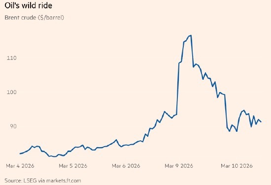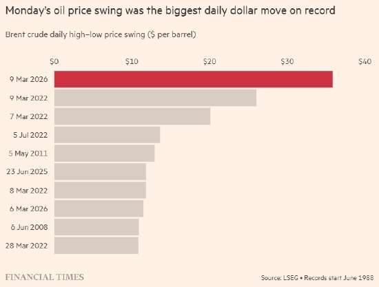 在接下来的23小时里,作为基准的布伦特原油价格一度飙升至每桶119美元,随后暴跌至84美元,创下有记录以来按美元计算的最大日内波动幅度。