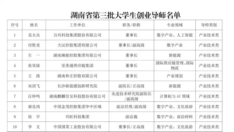 长沙晚报掌上长沙3月12日讯(全媒体记者 刘攀)记者今日获悉,为贯彻落实省委十二届七次全会关于支持大学生创业“七个一”部署要求,根据《湖南省大力支持大学生创业若干政策措施》要求,实施创业导师倍增提升计划网上配资门户网,进一步充实创业导师库,湖南省第三批200名大学生创业导师名单已公布,今后将更好为大学生创业提供精准指导和服务。此次入库的导师包括万兴科技集团股份有限公司董事长吴太兵、大汉控股集团有限公司董事长付胜龙、湖南湘能控股集团有限公司董事长左一等。(点击查看导师名单→名单.doc)