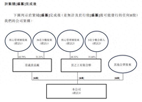 股权结构方面,公司核心管理层股东(合共持有崇义食品厂68.79%注册资本及云之上有限合伙68.32%合伙权益)已签订一致行动协议,连同崇义食品厂及云之上有限合伙构成公司的控股股东。