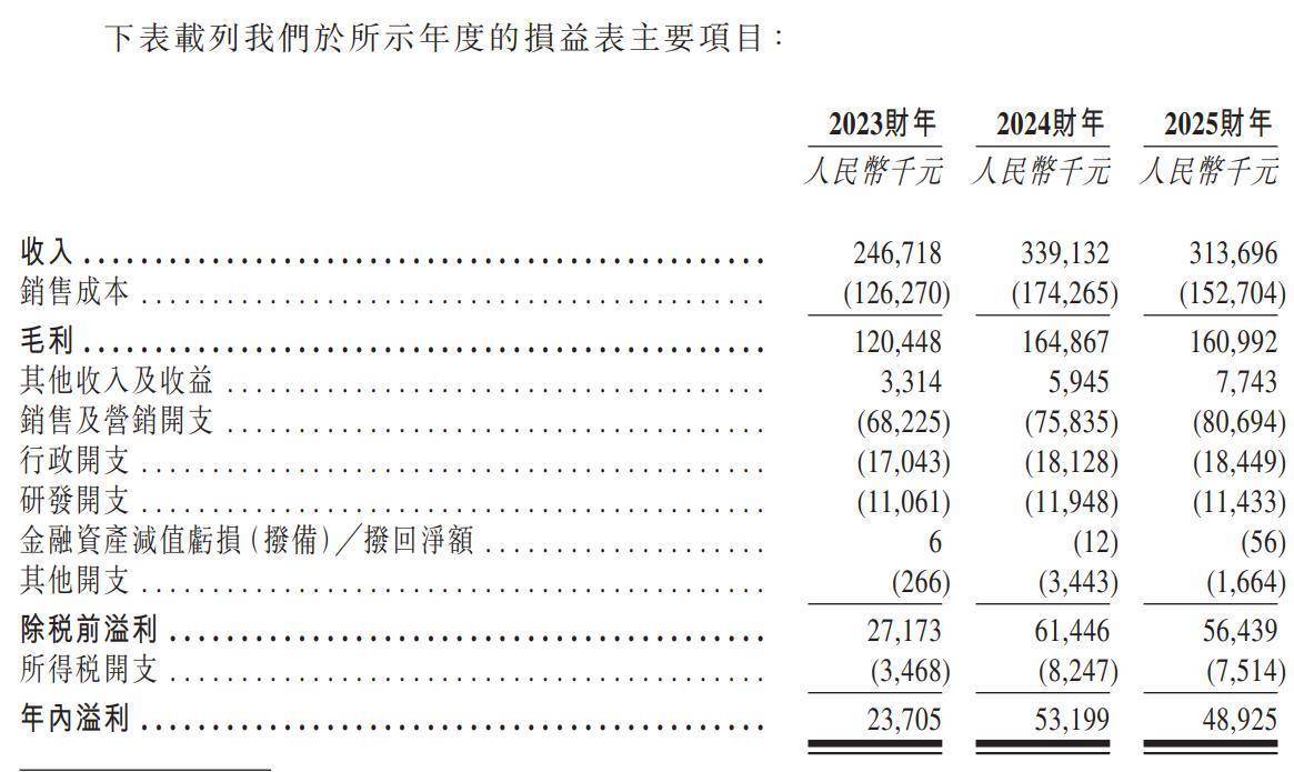 招股书显示,2023财年、2024财年及2025财年(截至2025年12月31日),齐云山食品实现营业收入分别为2.47亿元、3.39亿元和3.14亿元;同期净利润分别为2371万元、5320万元和4893万元。