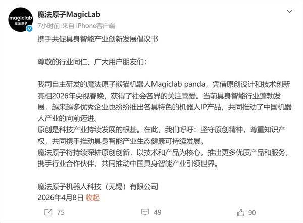 魔法原子强调其自主研发的“魔法熊猫机器人MagicLab Panda”为原创设计,并指出原创是科技产业持续发展的根基。同时呼吁行业共同坚守原创精神、尊重知识产权,携手推动具身智能产业生态健康、可持续发展。